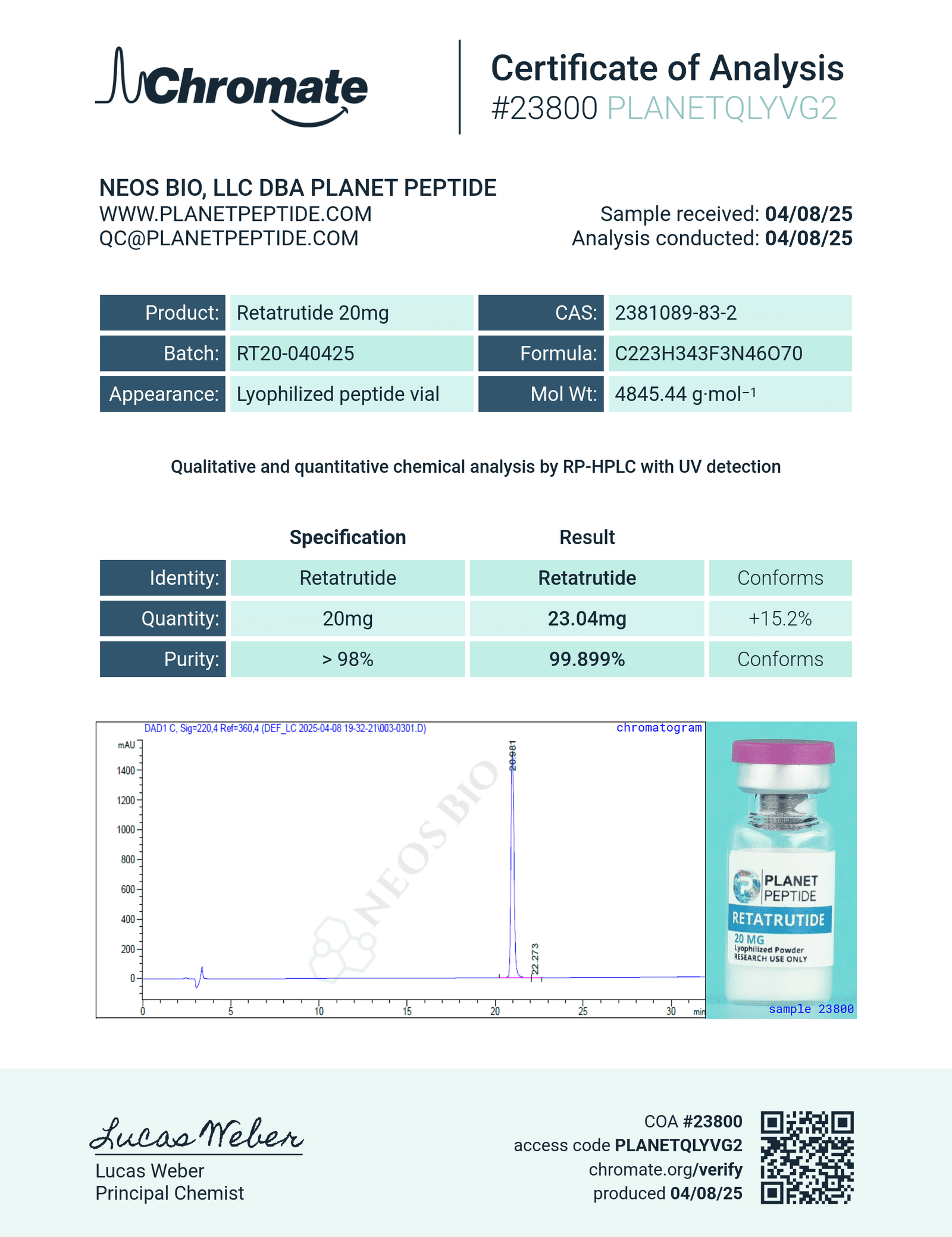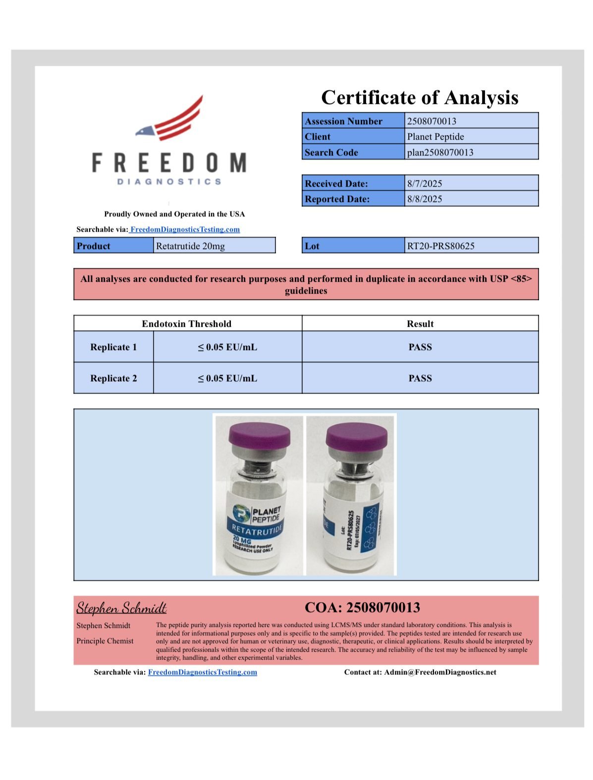 Retatrutide Lyophilized Powder offers a high-quality solution, providing 10 vials of  20 milligrams (mg) of pure Retatrutide. Our Retatrutide is meticulously processed to maintain its integrity and stability, making it an excellent choice for various scientific applications. It undergoes third-party testing to ensure its purity.