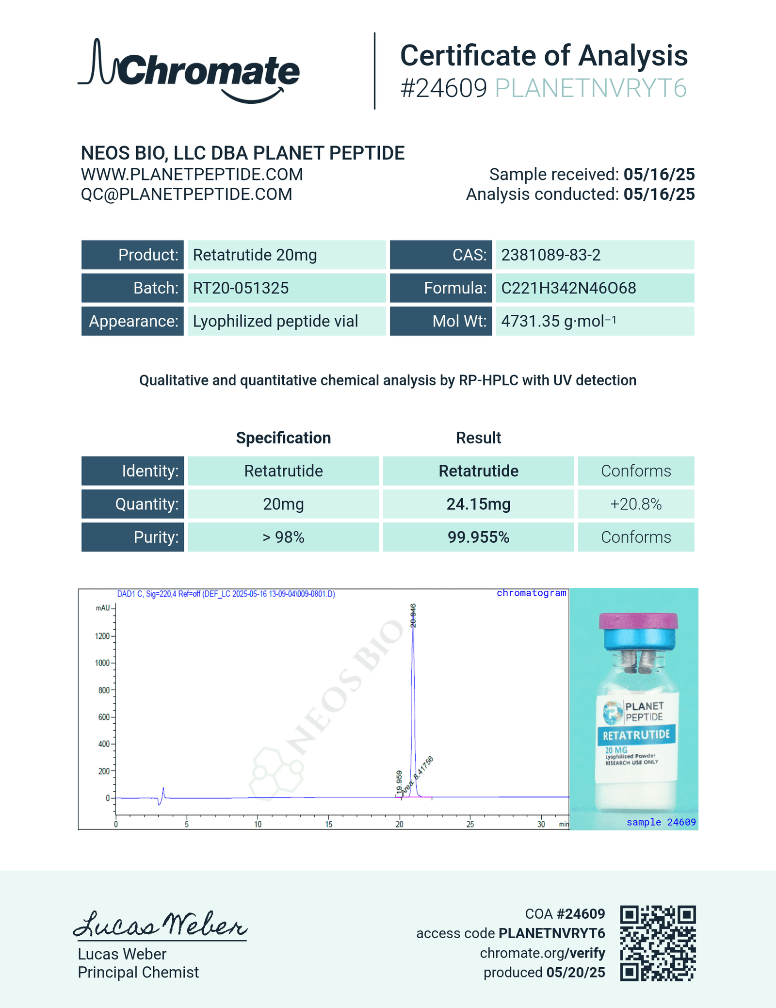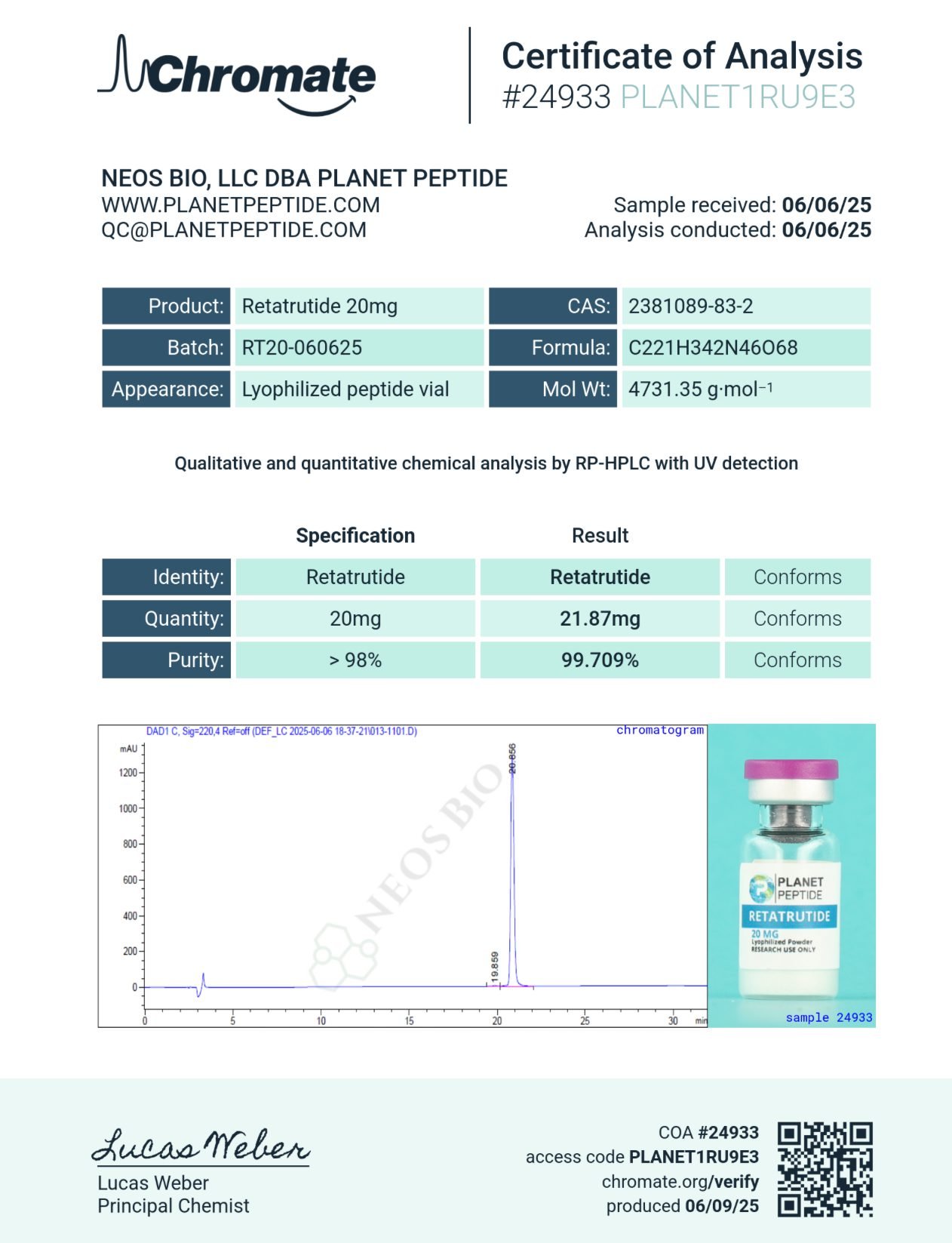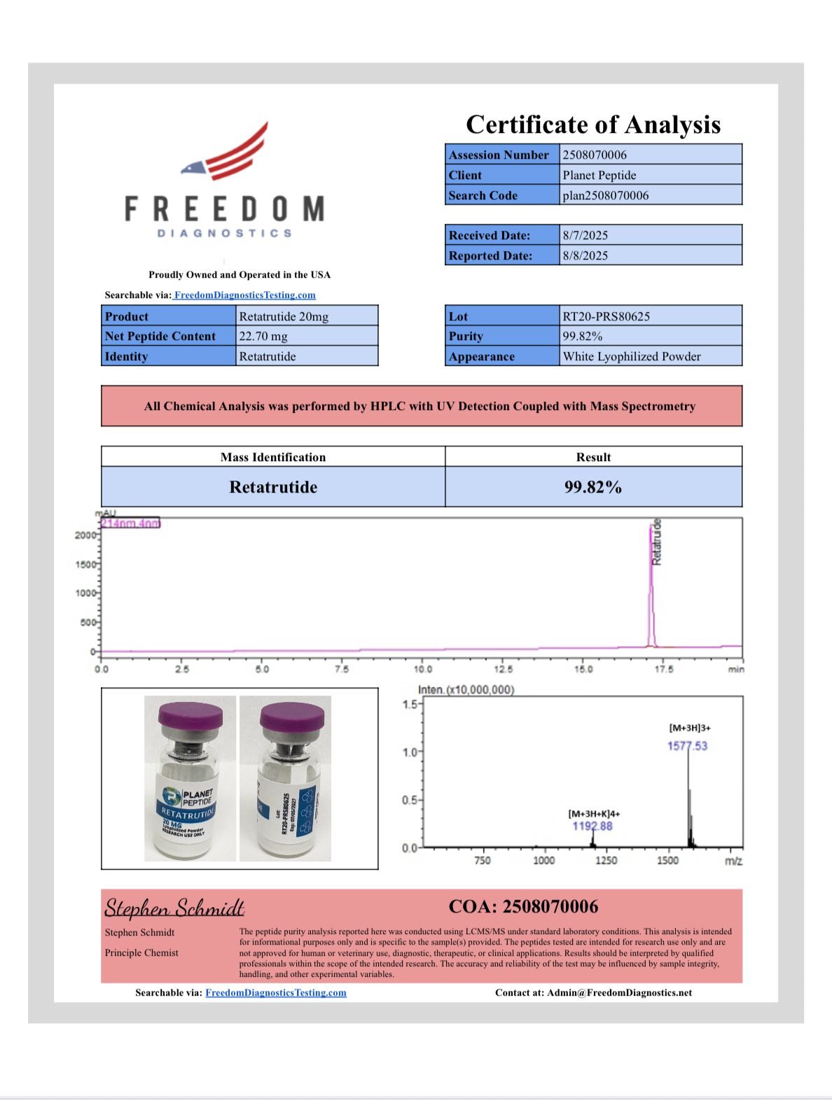 Retatrutide / LY3437943 Lyophilized Powder offers a high-quality solution, providing 10- 20 milligram (mg) vials of pure Retatrutide. It undergoes thorough third-party testing to ensure its purity.