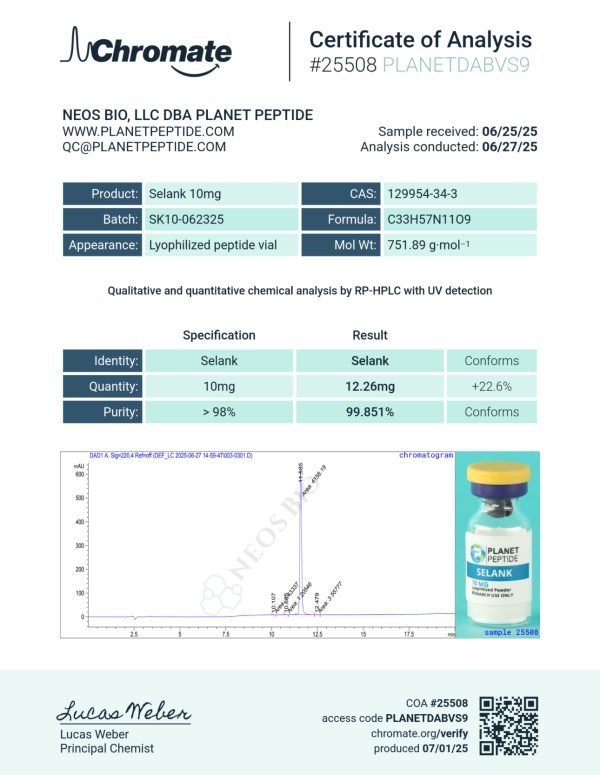 Selank Lyophilized Powder offers a high-quality solution, providing 10 milligrams (mg) of 99% pure Selank. This synthetic peptide, consisting of seven amino acids, is derived from tuftsin. Our Selank is meticulously processed to maintain its integrity and stability, making it an excellent choice for various scientific applications. It undergoes rigorous third-party testing to ensure its purity.