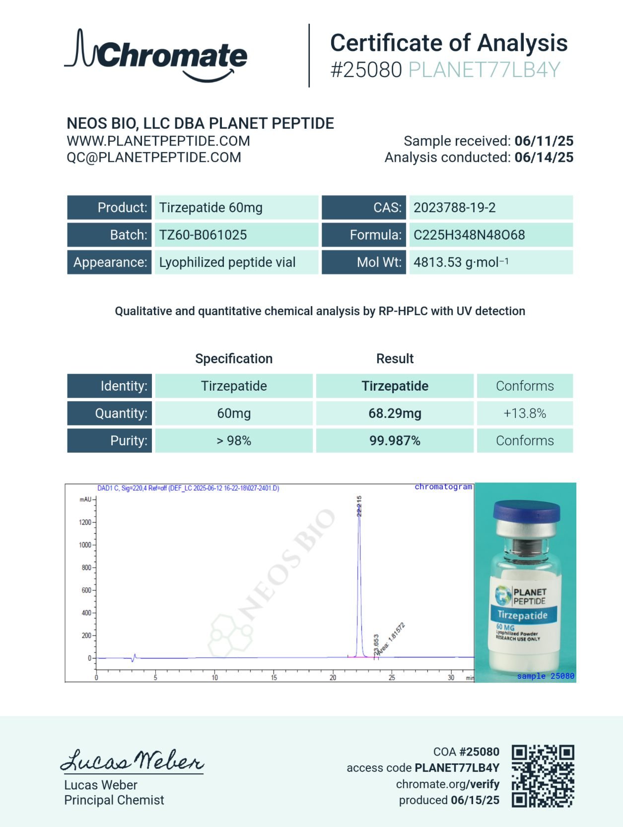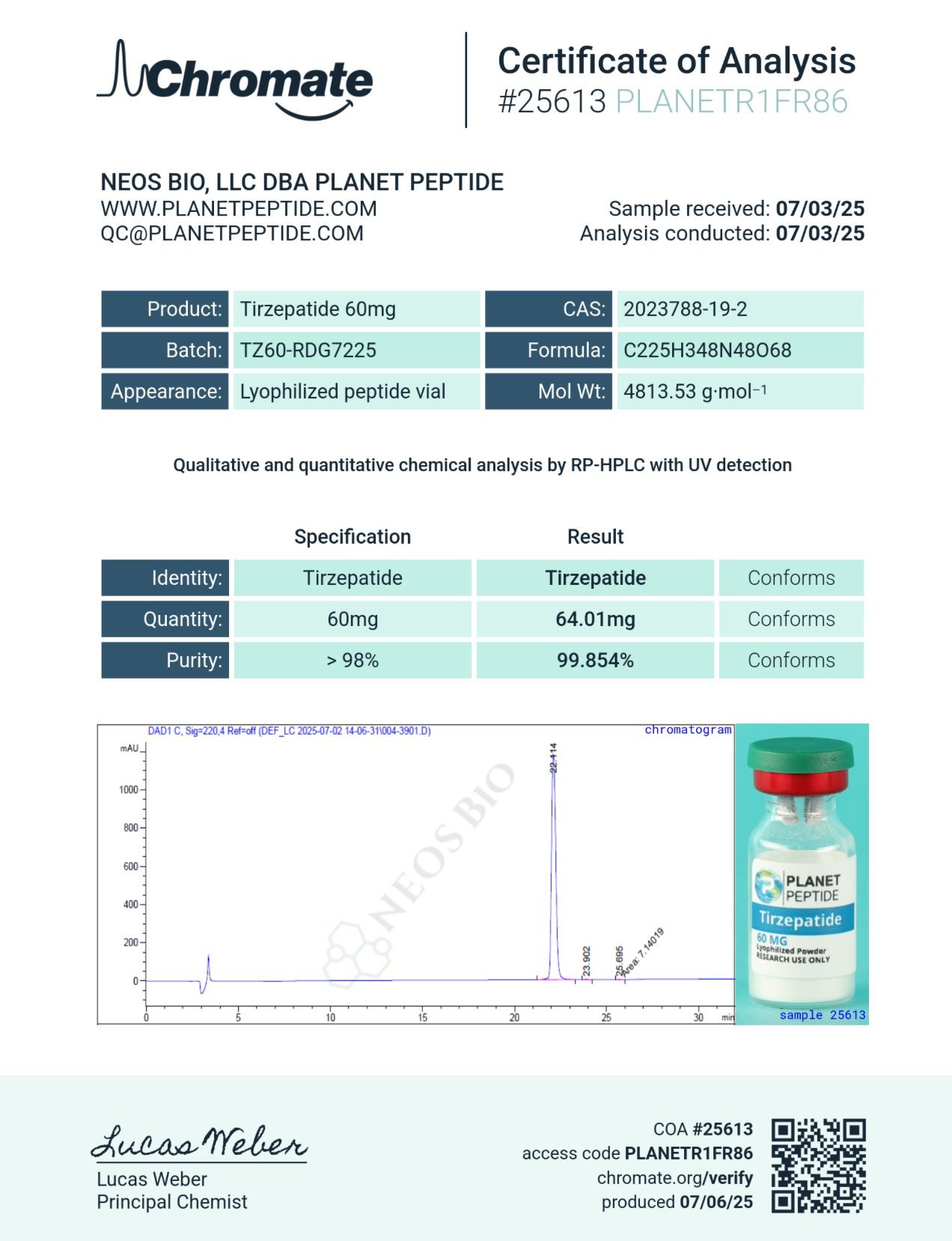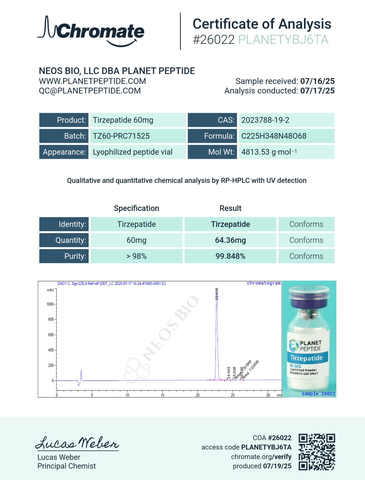Tirzepatide Lyophilized Powder offers a high-quality solution, providing 60 milligrams (mg) of pure Tirzepatide. Our Tirzepatide is meticulously processed to maintain its integrity and stability, making it an excellent choice for various scientific applications.  It undergoes third-party testing to ensure its purity.