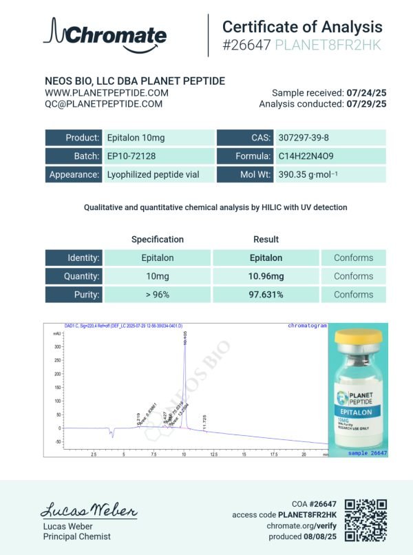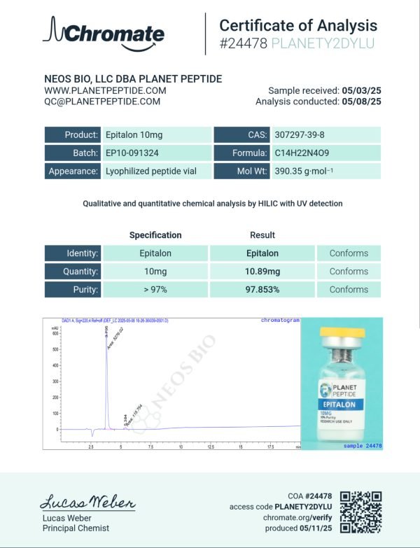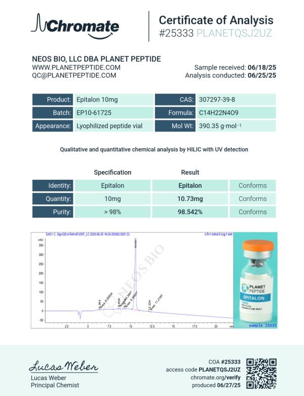Epitalon is a synthetic peptide and telomerase activator. Our Epitalon is meticulously processed to maintain its integrity and stability, making it ideal for various scientific research and development applications. Furthermore, it undergoes third-party testing to confirm its purity.
