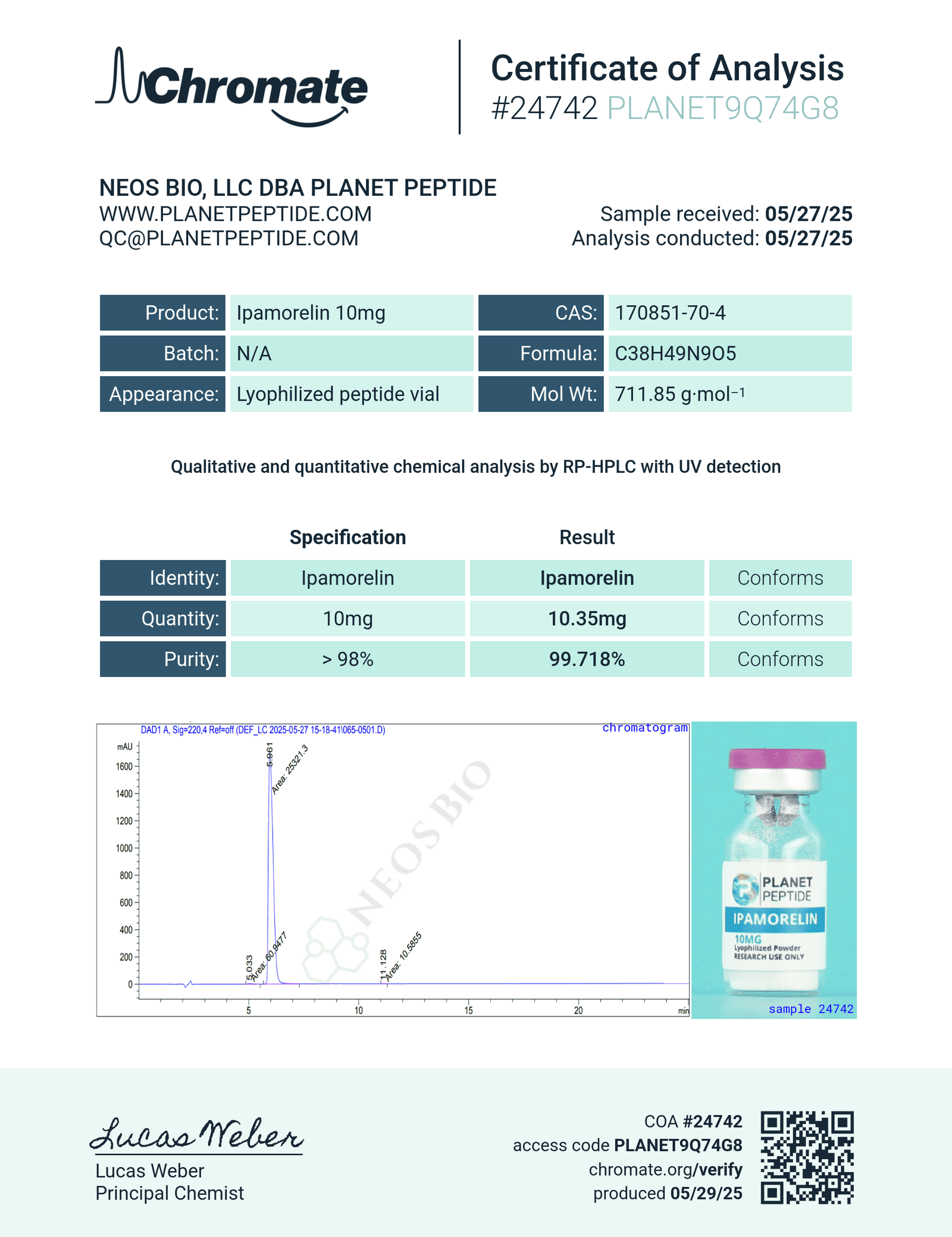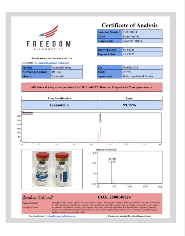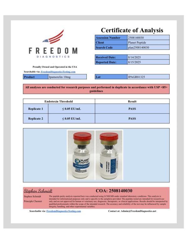 Ipamorelin Peptide 10 mg Lyophilized Powder delivers a precise dosage of 10 milligrams (mg) of pure Ipamorelin. Our Ipamorelin undergoes meticulous lyophilization to ensure stability and preserve its activity. Each batch is rigorously tested by a third party to verify purity and consistency, meeting the highest standards for biomedical and therapeutic research applications.