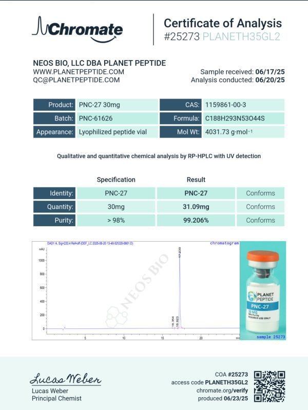 Our PNC-27 is meticulously processed to ensure maximum integrity and stability, undergoing rigorous third-party testing to guarantee purity. This makes it a reliable choice for advanced scientific research and development.