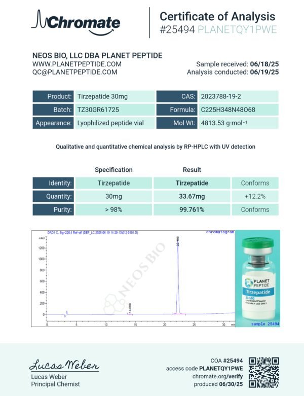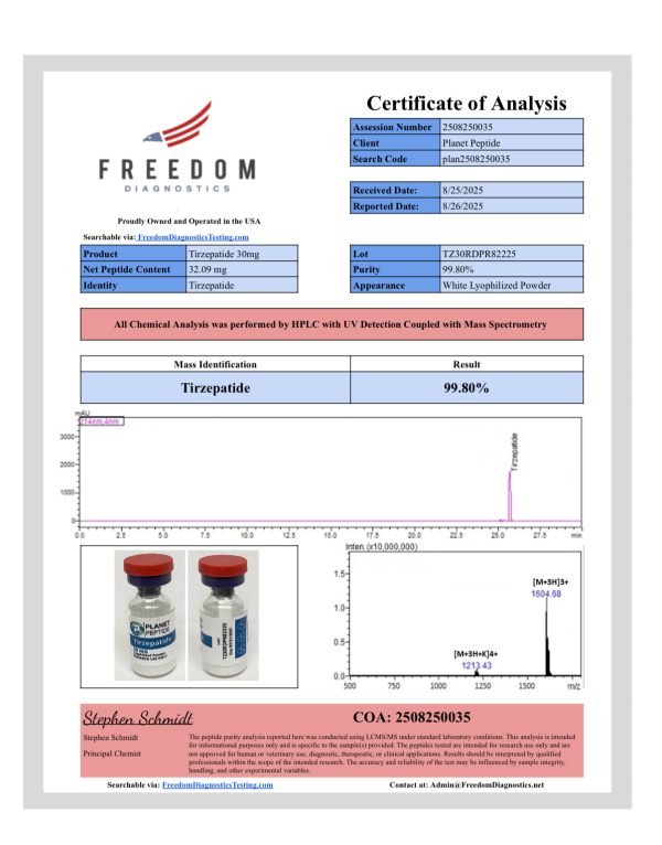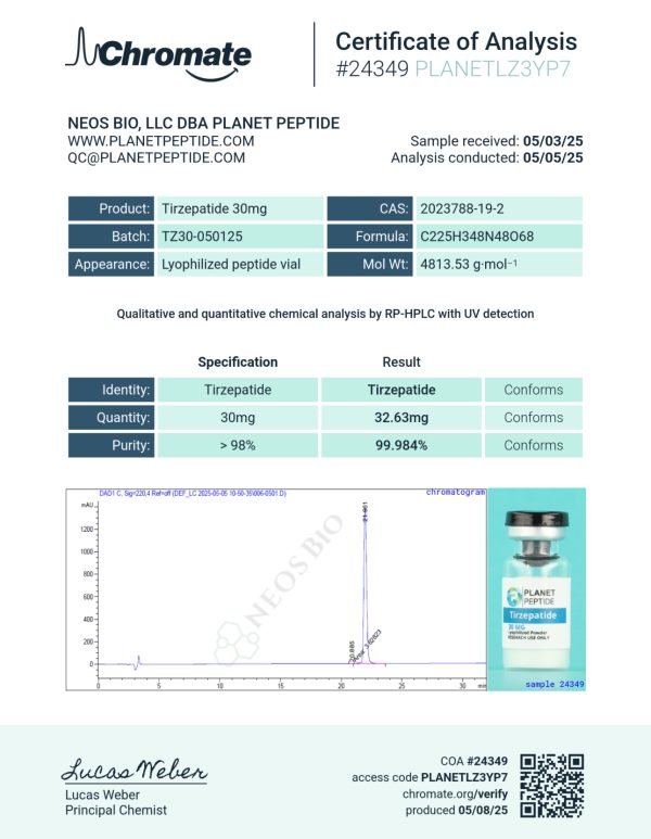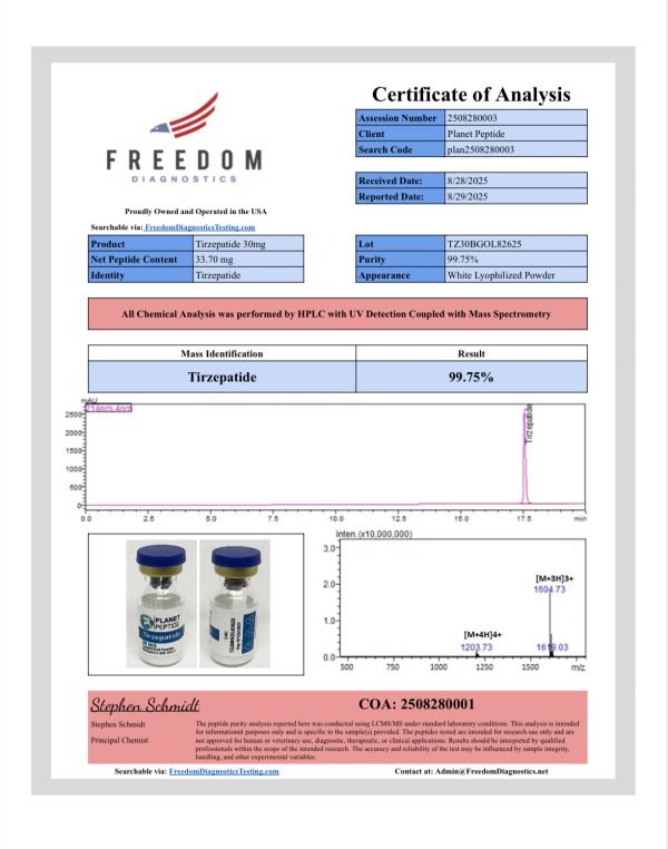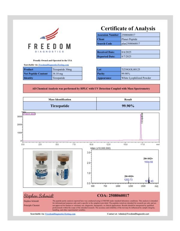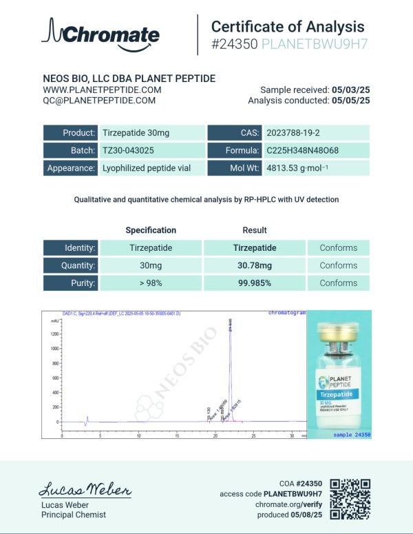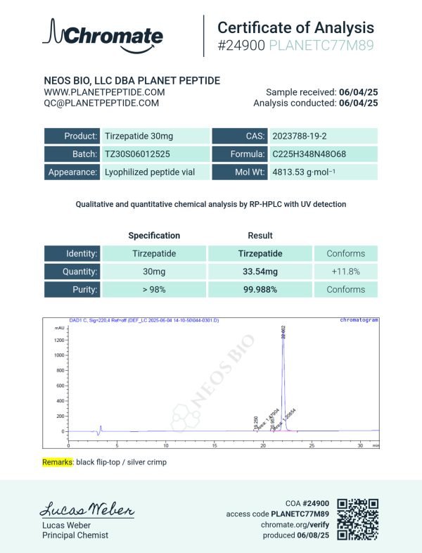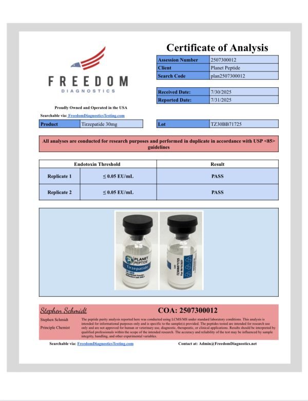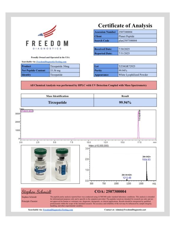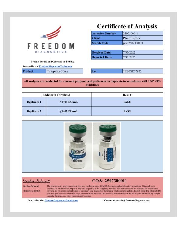 Tirzepatide Lyophilized Powder offers a high-quality solution, providing 30 milligrams (mg) of pure Tirzepatide. It undergoes thorough third-party testing to ensure its purity.