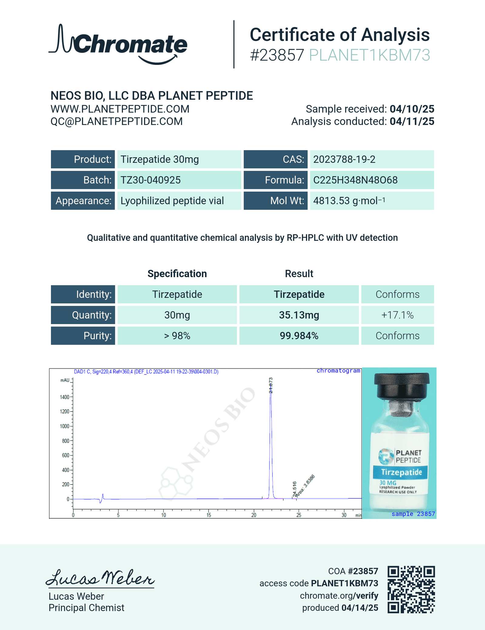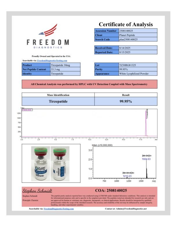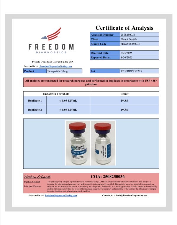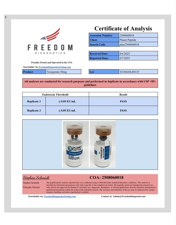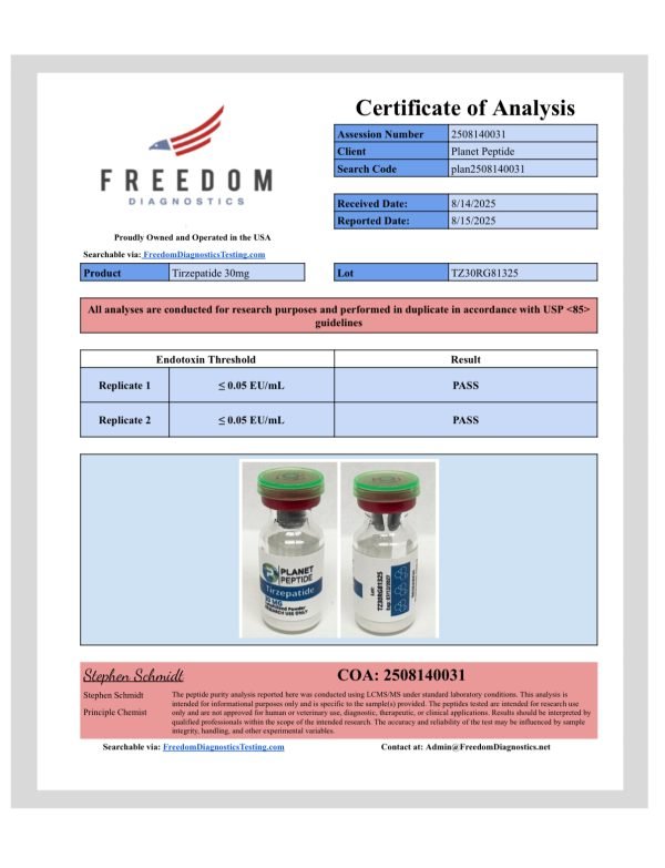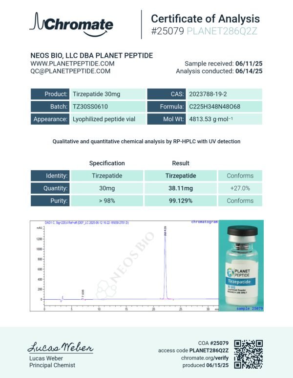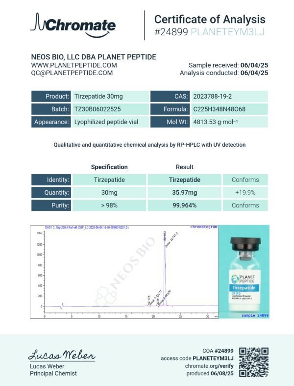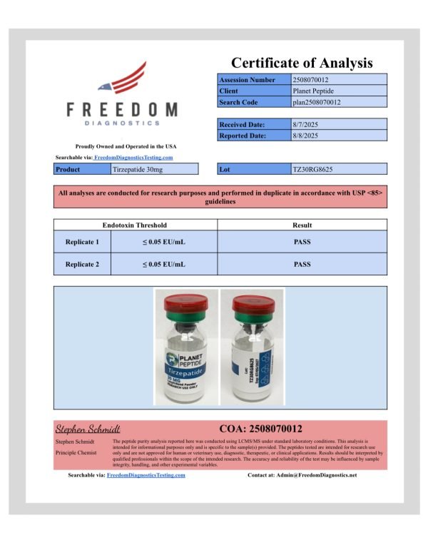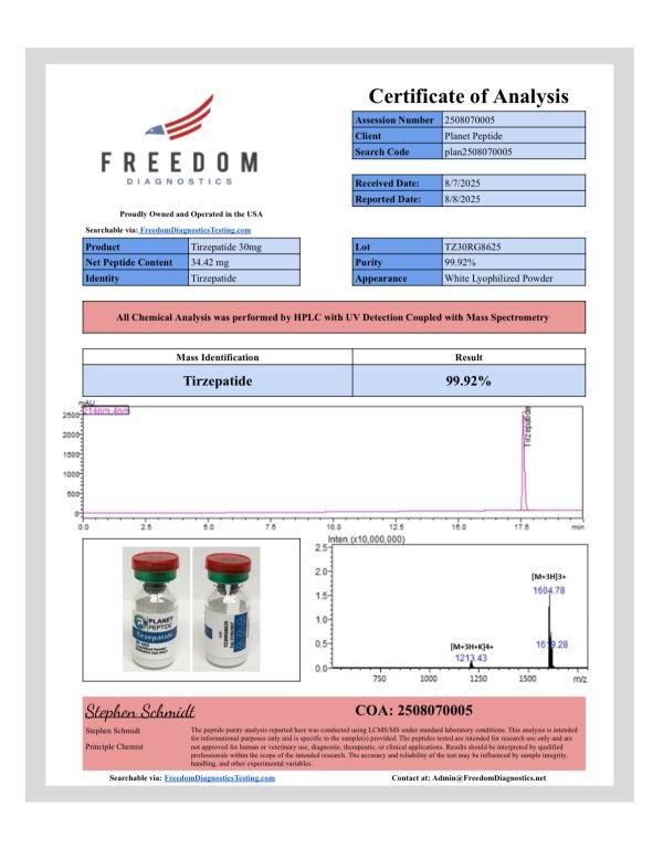 Tirzepatide Lyophilized Powder offers a high-quality solution, providing 30 milligrams (mg) of pure Tirzepatide. It undergoes thorough third-party testing to ensure its purity.